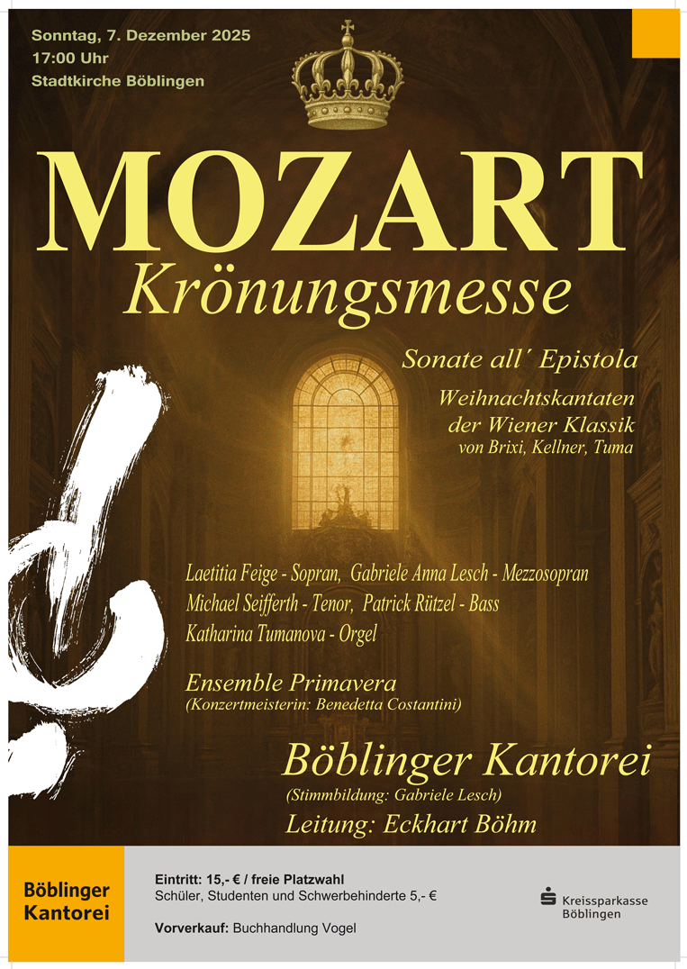 Im zweiten Teil des Programms steht die „Krönungsmesse KV 317“ von Wolfgang Amadeus Mozart. Ein Meisterwerk in der Behandlung des Messetextes und gleichzeitiger formaler Klarheit in den Formen seiner Zeit. Als Einschübe zwischen den Messeteilen erklingen zwei seiner „Sonate all´ Epistola“: diese im Grunde kleine Sinfonien sind in der Salzburger Praxis nach der Lesung der Epistel (Apostelbriefe) im Gottesdienst seinerzeit erklungen.